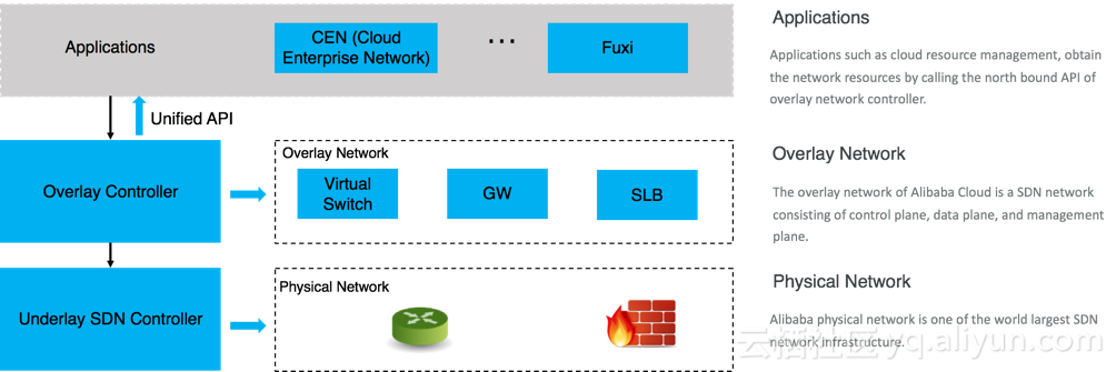 如下图, 阿里云网络主要由三个层面组成: 底层的物理层及其SDN控制器, Overlay网络层及其SDN控制器, 以及应用层. 其中每个层面都由更细节的模块组成. 阿里云的物理层网络是世界上最大的SDN网络之一, 可以细分为DC 网络, 阿里城域网, 阿里骨干网等组件, 物理层的控制器负责管理物理层网络, 并向Overlay层提供 API, 屏蔽各种物理网络的细节, 在本文中不会对物理网络展开描述; Overlay 网络层则由网关(Gateway), 阿里虚拟交换机(AVS: Alibaba Virtual Switch), 负载均衡器(SLB: Server Load Balance)等本层数据面的网络组件, Overlay 网络层的控制平面以及 Overlay 网络层的管理平面组成. Overlay 网络层控制器负责管理各个网络组件, 向应用层的产品和服务提供统一的API, 并调用物理层的控制器完成网络功能; 应用层则主要是阿里云网络的各大主要产品如CEN和资源管理调度系统(例如伏羲), 它们通过调用Overlay控制器的北向接口实现了阿里云网络的使用和调度.