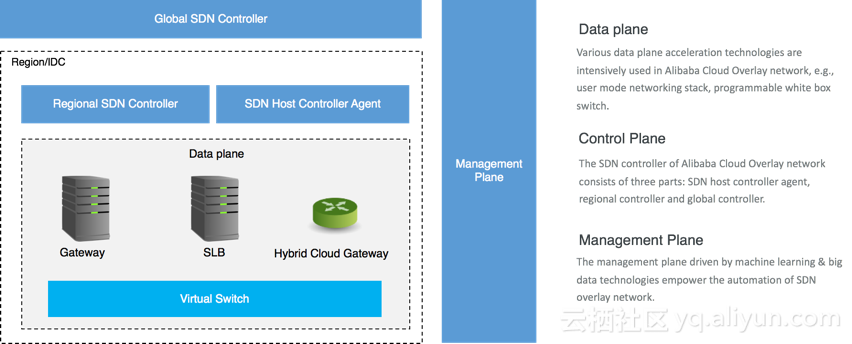 阿里云网络的 Overlay 层是一个基于 SDN 的网络架构, 可以分为三个平面: 数据平面, 控制平面和管理平面. Overlay 的数据平面主要由各种网络组件组成, 包括 SLB, AVS, Gateway, hybrid Gateway 等组件, 为了提高这些组件的转发性能, 阿里云网络组引入了很多数据面的加速技术, 例如用户态协议栈技术,; Overlay 网络的控制面则由一个层次性的控制器系统组成, 这主要是为了保证控制平面的可拓展性, 在每个主机上, 存在一个主机控制器(host controller), 在每个地区(region), 存在一个区域控制器(region controller), 最后, 还存在一个全局控制器(global controller). 主机控制器负责从区域控制器获取各个数据面的组件的配置方案, 区域控制器则负责本区域的Overlay网络层的管理与调度, 全局控制器则负责协调调度各个region的 overlay 网络资源, 尤其是全局流量的管理与调度; Overlay 网络的管理平面则是一个单独的实体, 负责从Overlay的另外两个平面的日志, 数据库等记录中搜集数据, 以便于现场恢复和异常调试, 也能够通过对数据的分析和学习, 提供网络的自动化管理.