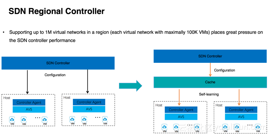 可拓展性设计: 阿里云网络的底层物理网络一直处于迅速扩张的过程中, 因此Overlay 层的架构必须有足够的可扩展性. 而设计需求要求每个region的region controller 能够支持百万级的虚拟机网络(即 VPC), 每个 VPC 能够支持的虚拟机数量是十万级, 这是一个很难达到的目标. 在虚拟机和 VPC 的数量级还不是很大的初期, Overlay网络的控制面可以为直接直接向主机控制器推送配置信息, 但是随着机群规模的迅速增加, Overlay网络的控制面增加了一个缓冲层, 底层的数据面系统可以在缓冲层实现部分网络信息的自学习, 控制面也可以将部分功能下放到缓冲层实现, 进而减少控制面的功能和负载。