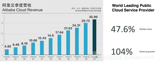 阿里云在近两年的发展非常迅速, 年营业额以104%的速度增长, 在2018财年的季度收入已经超过了30亿人民币, 国内市场占有率来到了47.6%, 成为了一个世界领先的公共云服务提供商. 阿里云全球的数据中心建设也囊括了各大洲的主要国家, 能够为全球各地的而用户提供云服务.