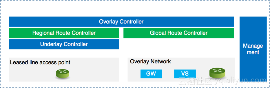 为了满足阿里云快速扩张的需求, 满足网络服务的可靠性, 满足自动化的网络管控, Overlay网络层必须保证高可拓展性, 高可用性, 以及智能性, 下文介绍了为了实现这些需求, Overlay网络的架构设计采用的方案.
