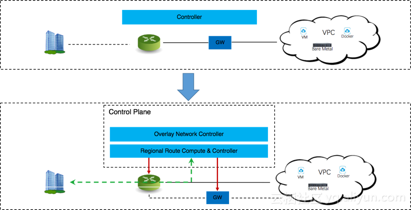 CEN控制面的功能也会随着新技术的应用进行适应性的变化, 例如下图中, 阿里云网络提高Overlay 网络层的数据面组件的网络性能同时, CEN的控制器系统就能够下放一部分控制功能到底层控制器, 通过控制器实现小范围内的路径优化和性能提高.