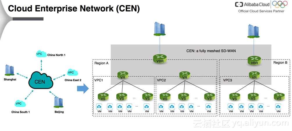 基于物理层和 Overlay 网络层提供的服务, 阿里云网络提供了很多出色的产品. 下文会介绍其中较有代表性的产品云企业网CEN(Cloud Enterprise Network)。
