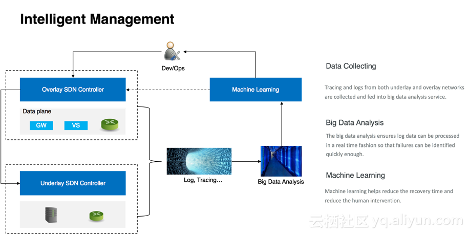 智能管理能力: 阿里云网络的管理系统能够从底层的物理网络的各个平面, 到 Overlay 网络的各个组成平面搜集所有的日志和信息记录, 并且这都是实时地完成. 因此, 阿里云网络不仅可以及时地发现物理层, Overlay 层的各种异常的出现, 还有望能够在机器学习的帮助下快速地定位到异常的原因,并且如果可以的话,自动作出响应。