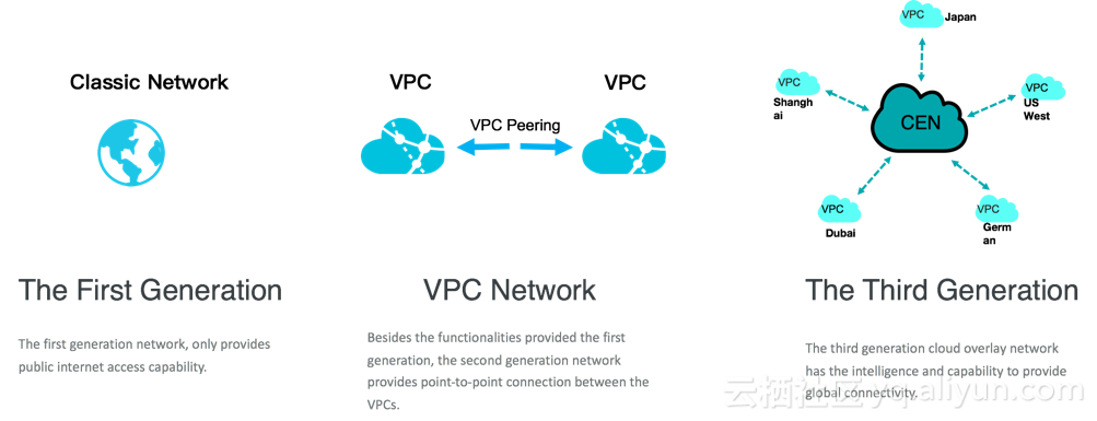 随着云服务提供商的服务内容的扩张, 云网络负责的连接实体也在增加, 虽然需要连接的依然是用户网络, 万维网与云网络, 但是对连接的实体的数量, 连接方式和连接质量的需求一直在提高. 对于阿里云网络而言, 最初提供的第一代网络只需要满足云服务到万维网的网络连通性, 但是很快就出现了更高的需求, 因此, 第二代网络, VPC 作为云上的网络实体出现, 为了保证所有网络实体的互联, VPC 之间的高速通道也一并出现. 但是这依然不能满足用户的需求, 因为用户可能有多个网络在使用不同的连接方式接入阿里云的服务, 因此, 阿里云网络通过基于 Overlay 网络的架构, 设计实现了第三代网络, CEN, 提供了当前网络实体的泛联能力, 和对网络的智能管控能力.