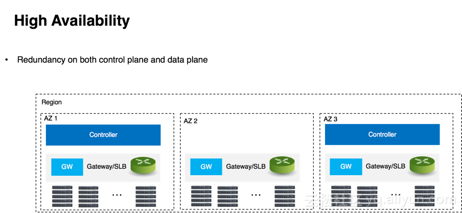 高可用性设计: 为了保证阿里云网络的高可用性, 必须保证功能组件的冗余度. 例如, 假如一个 region 由三个可用区域(AZ: Availability Zone)组成, 那么为了保证这个 region 的Gateway, SLB 的可用性, 阿里云网络会要求在三个 AZ 都部署这些组件, 并且互为备份, 即使某个区域的组件不可用, 其他区域的组件也会立刻填补空缺, 保证整体上的可用性. 控制器的部署也会遵守类似的高可用性规则进行复数的部署.