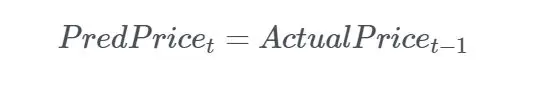 你可以看到训练时间大部分包含虚拟货币价格较低的时期。这样,训练数据或许无法代表测试数据,会损害模型泛化不可见数据的能力(你可以试着让数据更平稳些)。但干嘛让负面情况碍手碍脚呢?在使用我们的机器学习模型前,有必要讨论一个更简单些的模型。最基本的模型就是设定明天的价格等于今天的价格(我们称之为滞后模型)。我们在数学上以如下方式定义该模型: