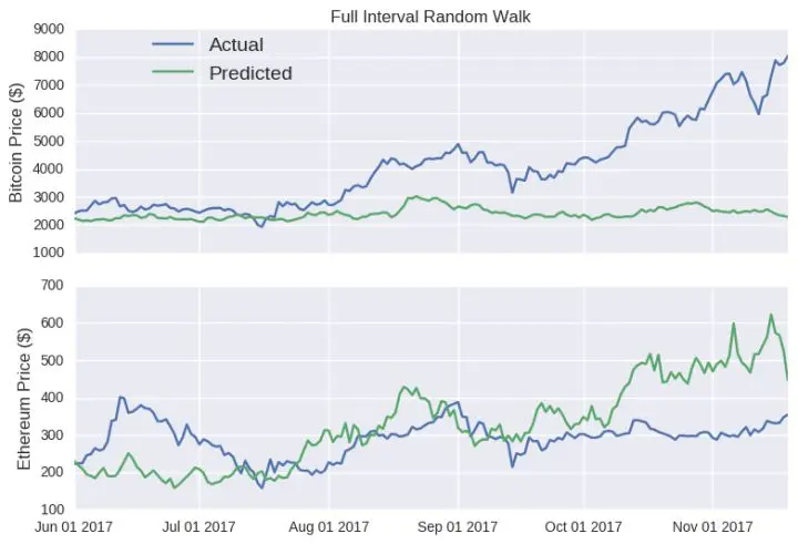 我们会从训练集中确定 μ 和 σ,将随机游走模型应用在比特币和以太坊的测试集上。
