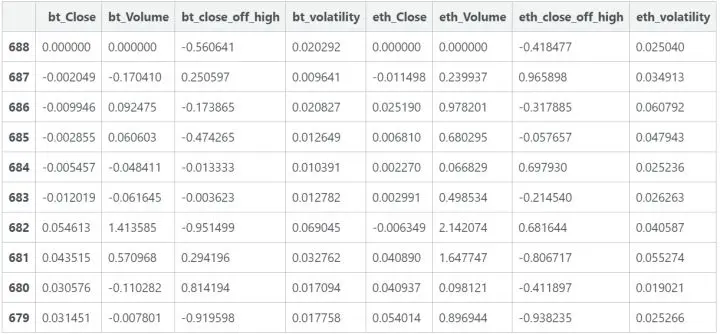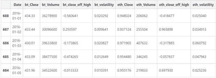 我创建了一个新的数据框架叫做 model_data。我将移出了之前的一些列(开盘价,每日最高价和最低价),重新表示了一些新列。Close_off_high 代表了当天收盘价和最高价之间的差额,其中值 -1 和 1 表示当天收盘价分别等于最低价和最高价。volatility列是指被开盘价分开的最低价和最高价的不同。你可能也注意到model_data是按照最早时间到最近时间的顺序排列的。我们实际上并不需要日期列了,因为不需要再向模型中输入这项信息。