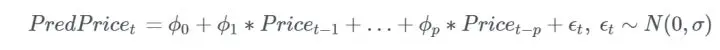 我前面强调过,单点预测具有误导性。那么在仔细看看,你会注意到预测值有规律地反应了之前的值(如十月份)。我们的深度学习 LSTM 模型在部分地方再生了一个顺序为 p 的自回归模型,在这些地方,未来的值就是之前 p 值的加权和。我们可以在数学上将自回归模型进行如下定义: