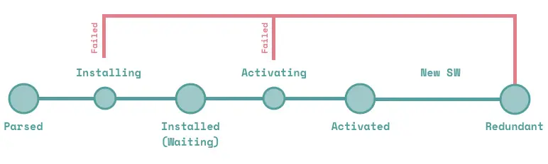 Redundant ( 废弃 ):这个状态的出现时有原因的,如果 installing 事件失败或者 activating 事件失败或者新的 SW 替换其成为激活态 worker 。installing 事件失败和 activating 事件失败的信息我们可以在 Chrome 浏览器的 DevTools 中查看