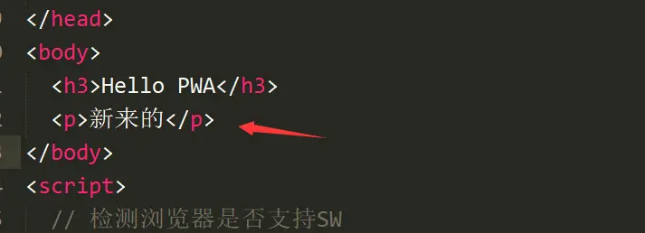 这个时候肯定会有同学在想,如果内容更新了,那么页面展示的内容是新内容呢还是旧内容呢?下面我们操作一下,打开 index.html 文件,我们在 body 中添加一个 p 标签 ,然后回到页面刷新。