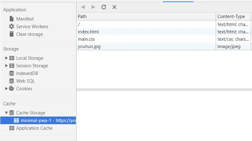 接下来我们断网操作,在 Application 中给 Offline 打上对勾就行啦。然后刷新页面,我们仍然能看到之前的页面,原因就是我们在上图看到,他的资源是从 SW 上获得到的。当我们第一次打开这个页面的时候,Resopnse 对象被存到了 Cache Storage ( 定义在 SW 规范中 ,相关资料请同学们自行查询啦 )中,我们看下图: