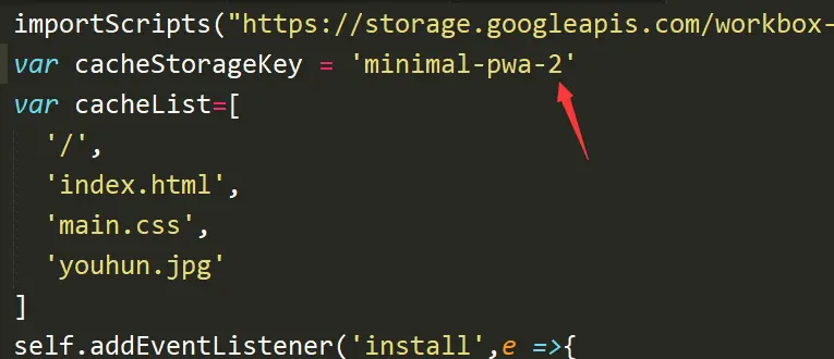 我们打开 sw.js 脚本文件,我们修改一下 cacheStorageKey。