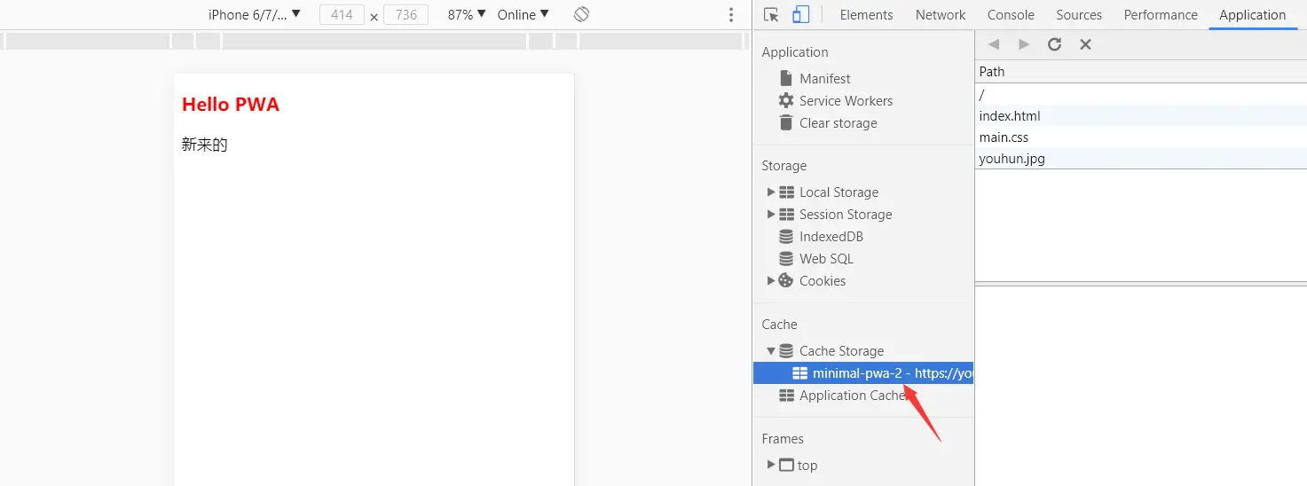 页面中出现了刚刚添加的P标签,我们再看一下 Cache Storage 中的缓存名字,已经被修改。
