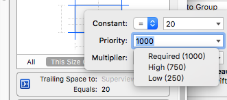 出现这样的警告一般是因为视图的约束条件之间有冲突,譬如:视图有两个约束条件,一个是条件A要求视图的宽度大于 200,另一个条件B要求视图的宽度小于等于他的父视图,如果不设置优先级,当父视图的宽度小于 200 时,A 条件和B条件之间就发生了冲突,系统不知道采用那个约束条件的情况下就会产生警告。而修改了优先级以后,会告诉系统,如果条件之间有冲突,优先满足优先级高的那个条件。