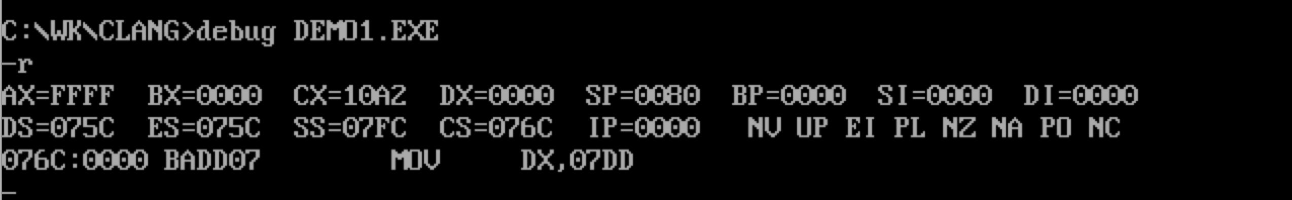 debug demo1.exe进入汇编调试环境. 执行r可以查看各个寄存器的状态,如下图
