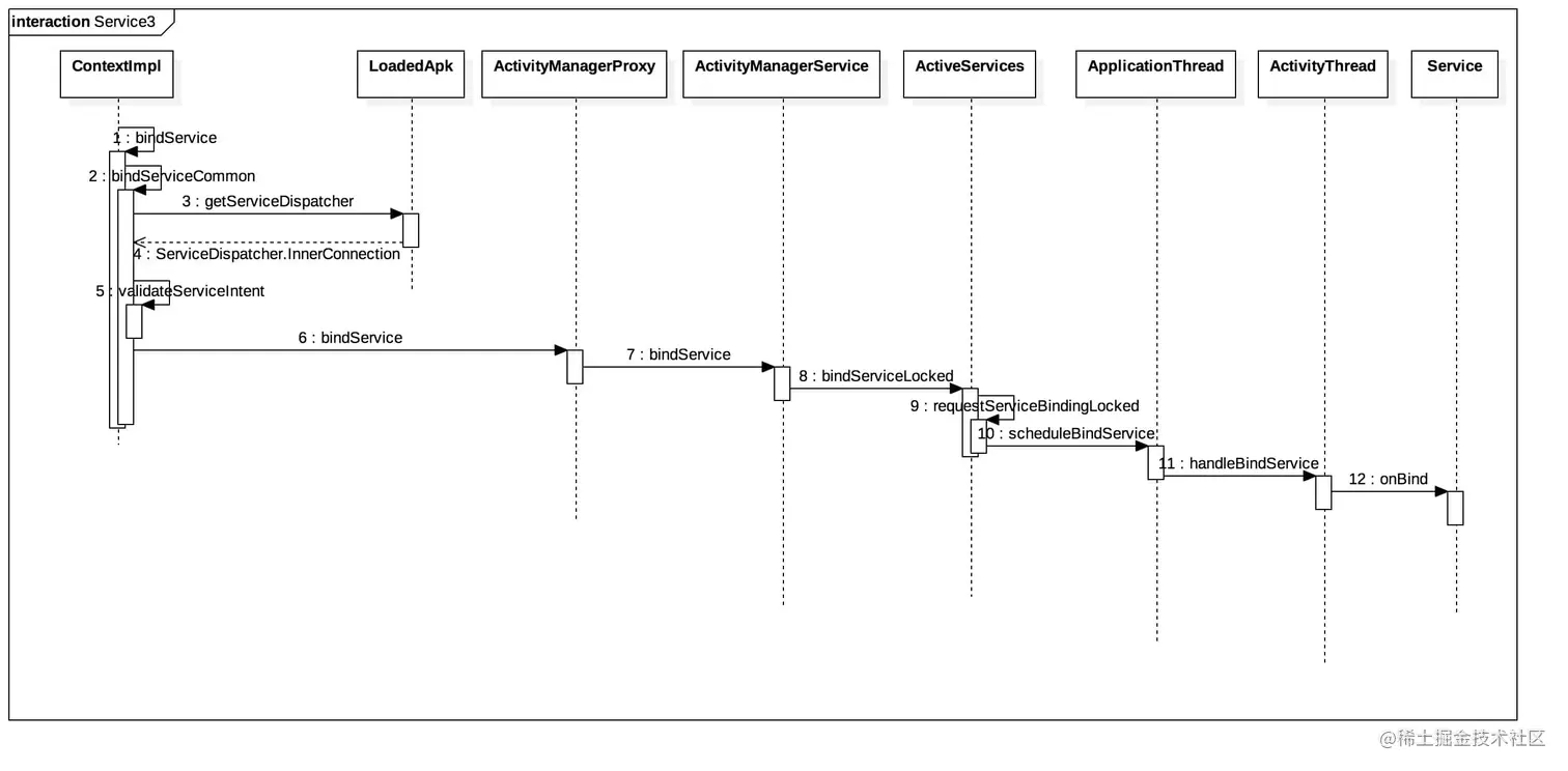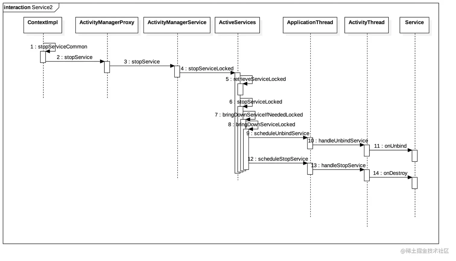 调用Service的onUnbind接触绑定。到这里接触绑定就分析完了,过程比较简单,只是上面的各种列表搞清楚要多看看。最后就剩下了stopService,我们一口气就将它分析完。