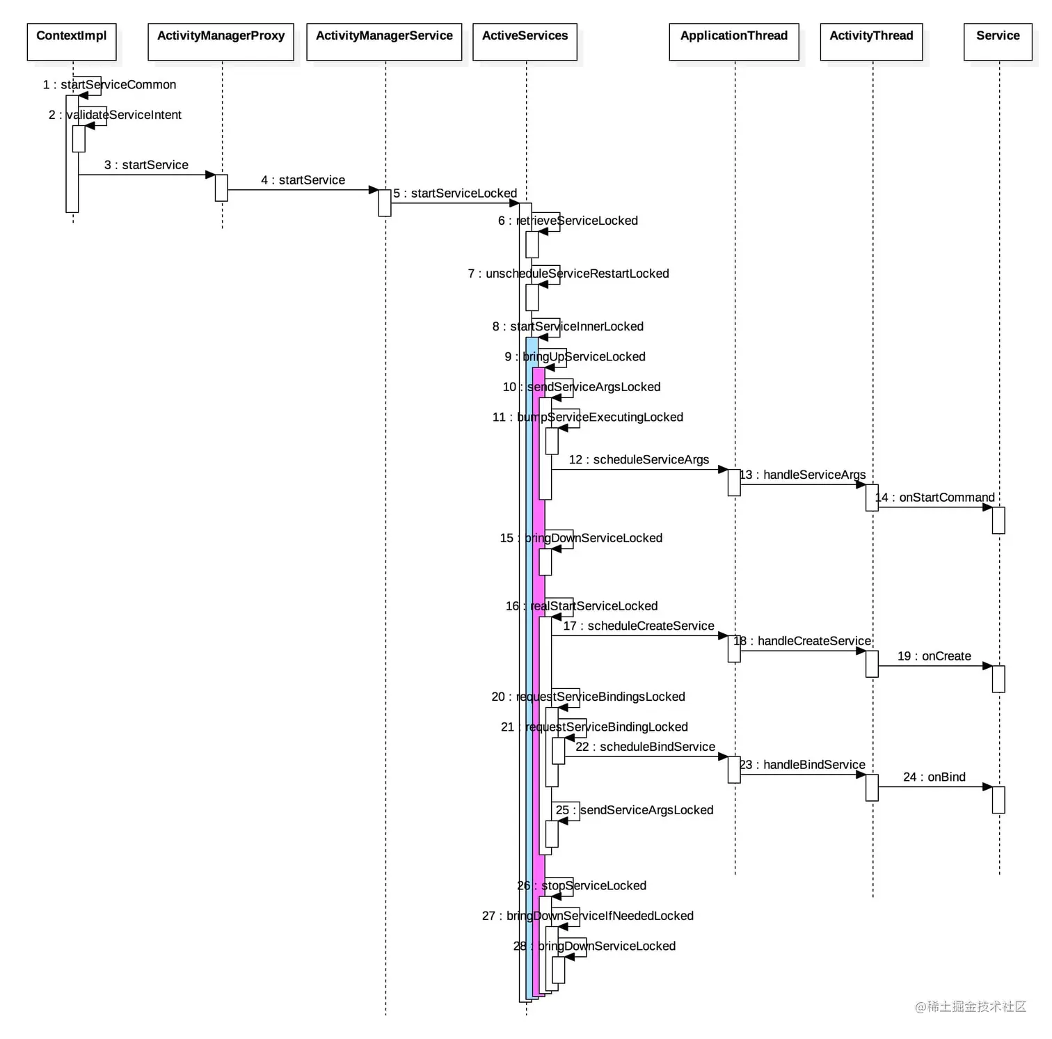 public ComponentName startService(IApplicationThread caller, Intent service,