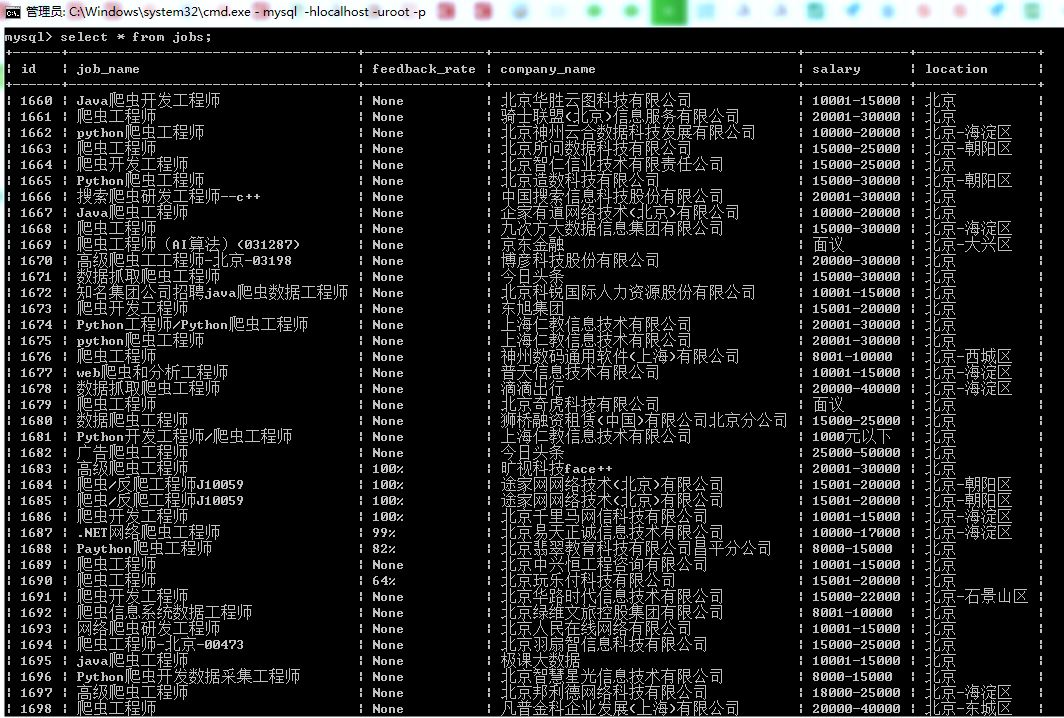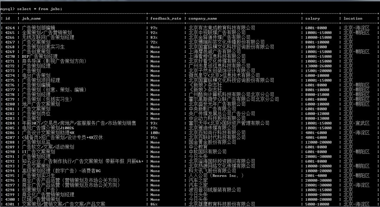 这是浏览器搜索之后得到的结果,从招聘信息中我们希望得到一些有用的信息。博主这里定义了五个字段信息:职位名称、反馈率、公司名称、职位月薪、工作地点。这些信息关系到你如何创建数据库表单,后面会提到。