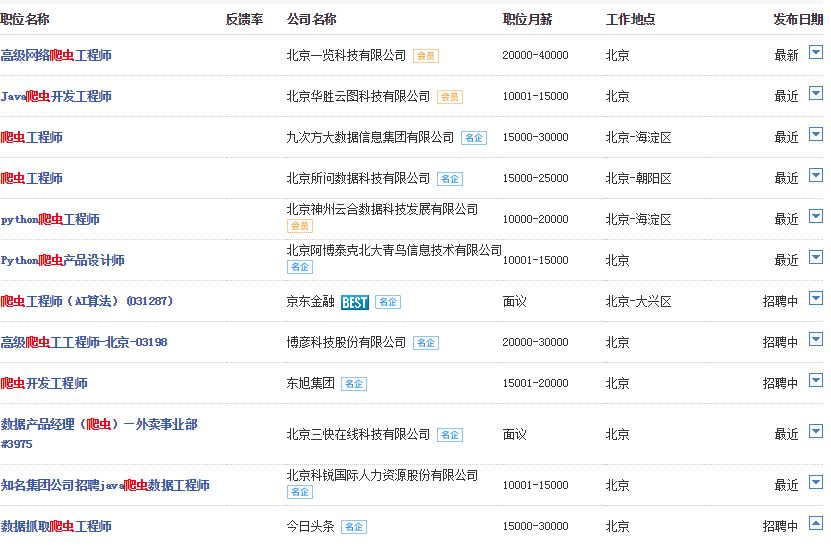 最近总被智联招聘广发骚扰,烦死个人了简直。索性点进去看了看爬虫工程师现在市场需求到底怎么样了?发展前景如何?看完了之后感觉目前还不错,根据北京来看职位需求还是蛮多的,薪资也还行,于是就对智联招聘职位信息的爬取发起了一次小小的挑战,今天给大家分享一个爬取招聘网站的工作信息,效果图如下(部分截图)。