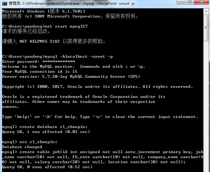 由于需要将解析后的数据存入数据库,因此需要先在命令窗口创建一个数据库(也可以在Python中完成),这里简单提一下所需的操作。
