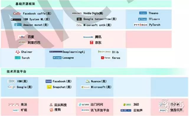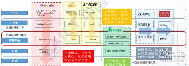 基础开源框架方面,优势企业如谷歌、亚马逊、脸书加快部署机器学习、深度学习底层平台,建立产业事实标准。目前业内已有近40个各类AI学习框架,生态竞争异常激烈。