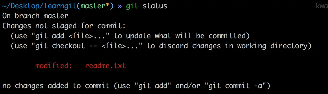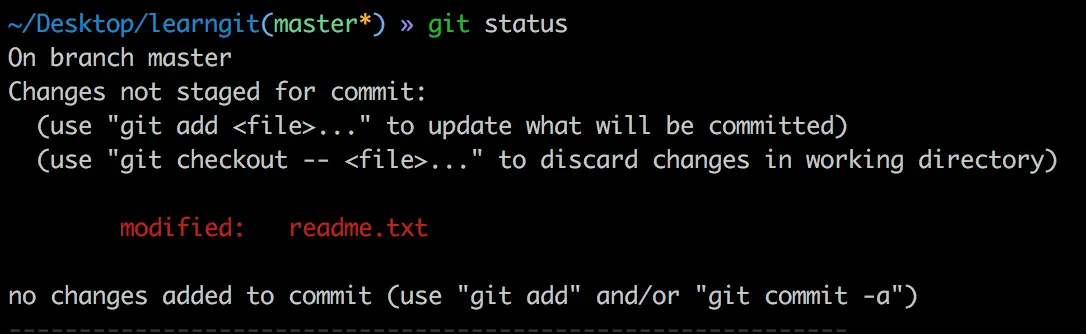 这时我们保存了,但还没有提交到缓冲区。用git status查看,git提示文件已修改。