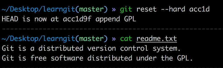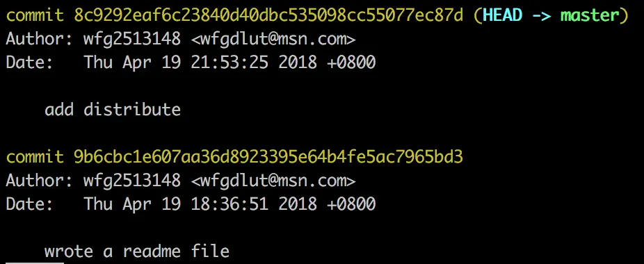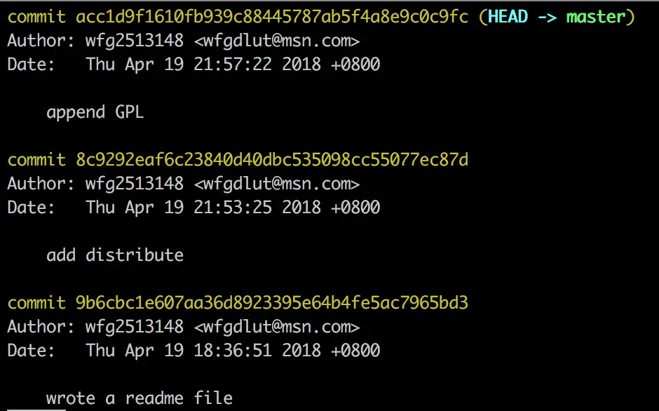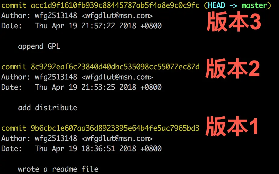 我们通过git log命令可以清楚地看到之前提交的版本。这里的一大串数字叫commit id。我们可以清楚地看到当前HEAD即是当前位置(append GPL)