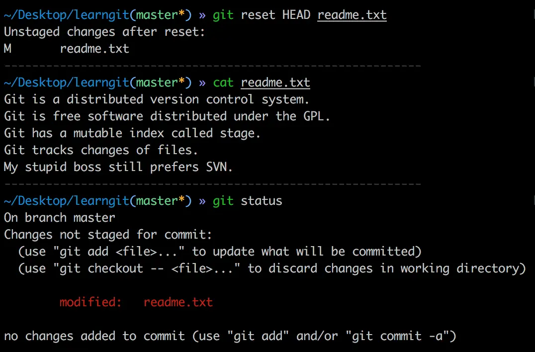 git reset HEAD filename命令既可以回退版本,也可以把暂存区的修改回退到工作区。当我们用HEAD时,表示最新的版本。
