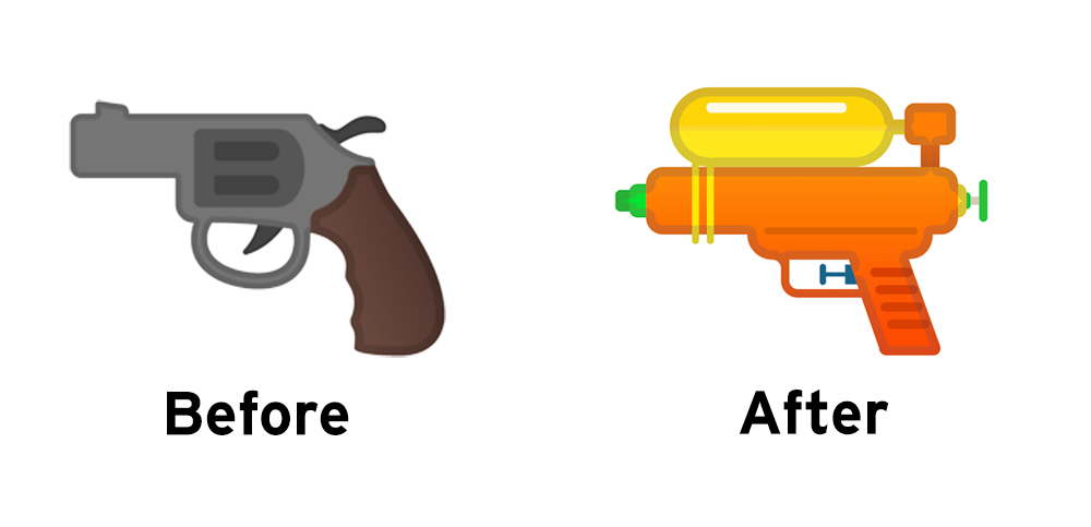 2016 年苹果发布 iOS 10 时改动了手枪的绘文字(Emoji),用绿水枪取代了现实版的手枪卡通画,而 Google、三星、Facebook 和 Twitter 等仍然使用后者。两年之后,三星、Twitter 和 Google 先后被发现替换了手枪绘文字。Google 在 GitHub 上的 Noto Emoji 库被发现用水枪替换了原来的手枪,而 Noto Emoji 是 Android 系统默认使用的 Emoji 库。