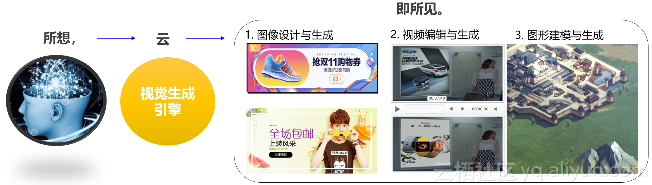 通过视觉生成引擎,我们希望能基于用户的所想,使得一切皆可生成。长远的目标就是:所想,即所见。