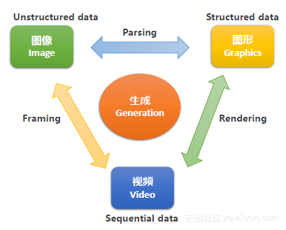 视觉生成主要分成三个方向。第一,针对非结构化的图像,如图像。第二,针对结构化的图形。第三,针对序列化的视频。