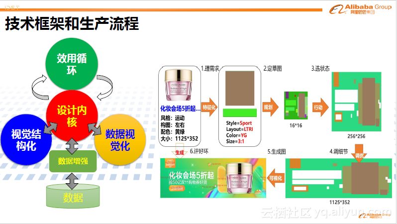 其技术框架如下图左侧。首先对视觉内容进行结构化理解,如分类、量化、特征化。其次通过一系列学习、决策变成满足用户需求的结构化信息即数据,最后将数据转化成可视的图像或视频。这一框架依赖于大量的现有数据。其核心是一个设计内核。同时,引入效用循环,利用使用后的反馈来不断迭代和改进系统。