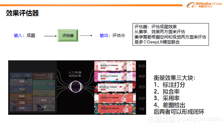 下一步是如何衡量结果的好坏。图像的评估相对比较主观,主要可以从美学和效果两方面来评估。美学角度可以包括是否对齐、色系搭配是否合理、有无遮挡这些较低级别的判断标准,以及较高级的,比如风格是否一致,是否切合主题。从效果上,产品投放后是否会在点击率等方面实现提升。最后将多个指标形成对应权重并形成多个DeepLR联合模型。