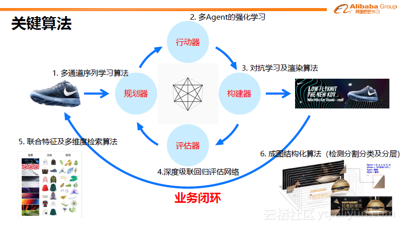 下面介绍一些关键算法。我们希望基于下图最左的耐克鞋生成最右的图。先通过规划器得到草图,再通过强化学习获得相对细致的结果,再通过对抗学习及渲染算法得到图片,再通过评估器进行评估,最后形成业务闭环,其中还会有一些基础的能力,包含更强的联合特征(非普通 CNN特征)及多维度检索算法等。