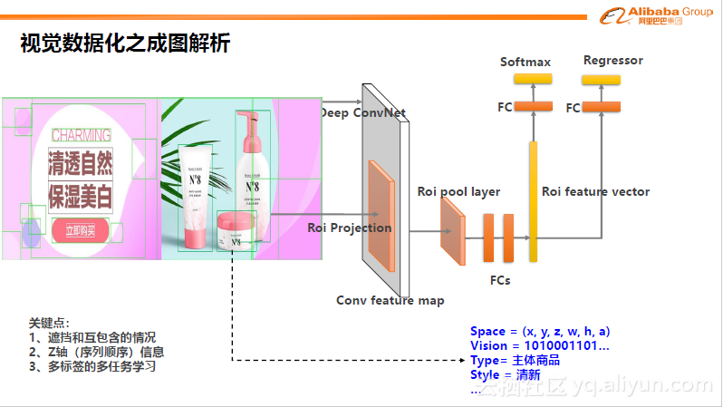 有了结构化信息之后,需要对信息进行量化。可以量化成特征或量化图。量化过程中会包含很多信息,比如主题风格、布局配色、元素种类、量化空间等。有了这些信息后可以在主题、种类、风格、视觉特征大小位置上,量化成各种码,用相对有限的特征来表达无限的图。