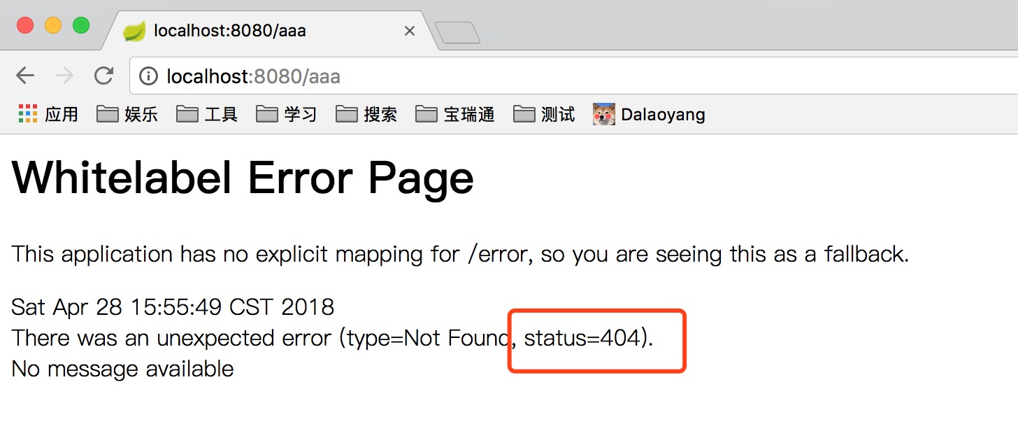 然后随便访问一个项目里没有的地址,比如http://localhost:8080/aaa,如下图所示,404没有找到:
