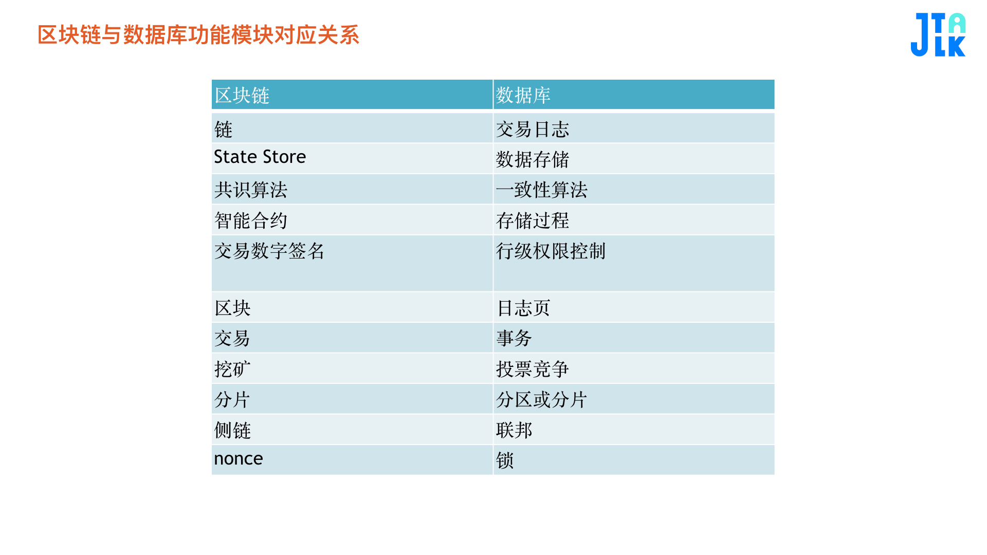 特性:共识机制、存储机制、智能合约、分片、应用开发接口、安全。这些实际上都是区块链底层老生常谈的一些模块,对应到数据库,有没有一些对应的点? 共识机制。在过去数据库架构里,所谓一致性控制都是有一个主节点,所有写操作会被复制到另外一个存节点做高可用配置。区块链上,可以把这个体系扩展,假设主节点并不是固定的,而是每10分钟换一次,在主节点MySQL,10分钟换一次主节点,某种程度上是相通的。不管是POW、POS所谓共识机制,真正本质是到底在一段时间之内以谁的信息为准,这个数据库里是以主节点为主,当它挂了以后,怎么选出一个新的节点,这些都不重要,只是实现问题。