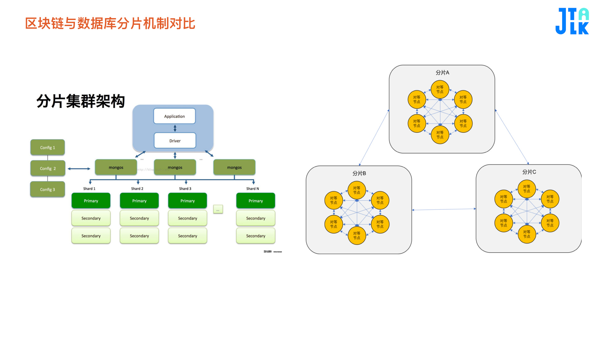 智能合约。是用户自定义的托管程序,在数据库里托管程序叫存储过程,在区块链里,本质是一样的,最大不同点在于安全性方面。在数据库里调存储过程,记录最终结果,但是在区块链里,因为不可信任,记录调用。 分片。大部分区块链项目里做得还不太成熟、不稳定,数据库分片是非常成熟的东西,区块链行业,由于分片之间交易很难保障,大部分区块链公链项目很难做好的分片。