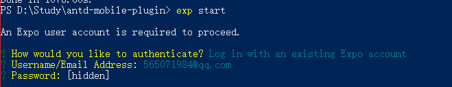 启动项目后会要求你输入你在App上注册的Expo账号和密码