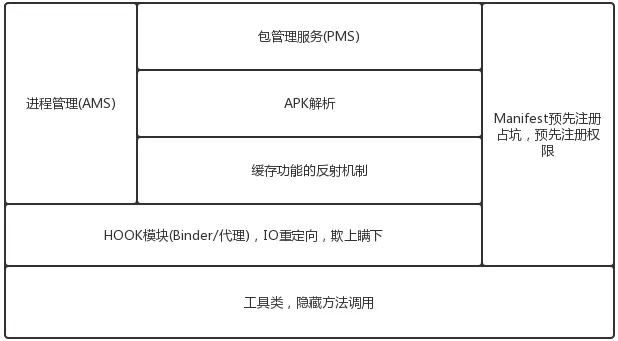 所谓Android虚拟化技术,就是利用Hook技术和沙箱机制,在一个Android应用中模拟出一个Android系统。双开的应用运行在虚拟化出来的Android系统中,与外部的Android系统完全隔离。