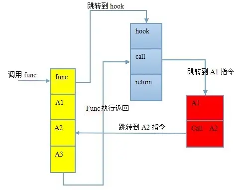 Inline Hook即内部跳转Hook,通过替换函数开始处的指令为跳转指令,使得原函数跳转到自己的函数,通常还会保留原函数的调用接口。其缺点是无法对一些太短的函数Hook。下图是inline hook原理示意图: