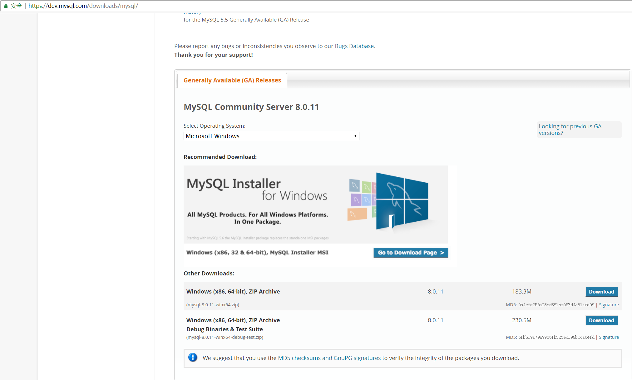 进入如下页面,点击Looking for previous GA versions?可以查询下载之前版本