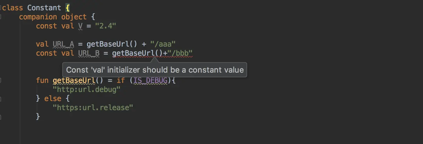- 对于绝对的常量,可以使用 const 关键字,此时在 Java 中和在 Kotlin 中的调用方式是一样的。const 只适用于直接初始化为一个 value 的情况。