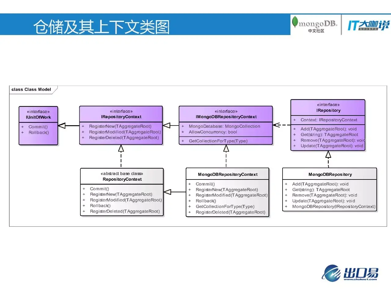 负责事务处理。每个聚合根的仓储都会关联到同一个仓库上下文。但是MongoDB 不支持事务,我们提供了虚拟实现。仓储上下文应用了工作单元模式。