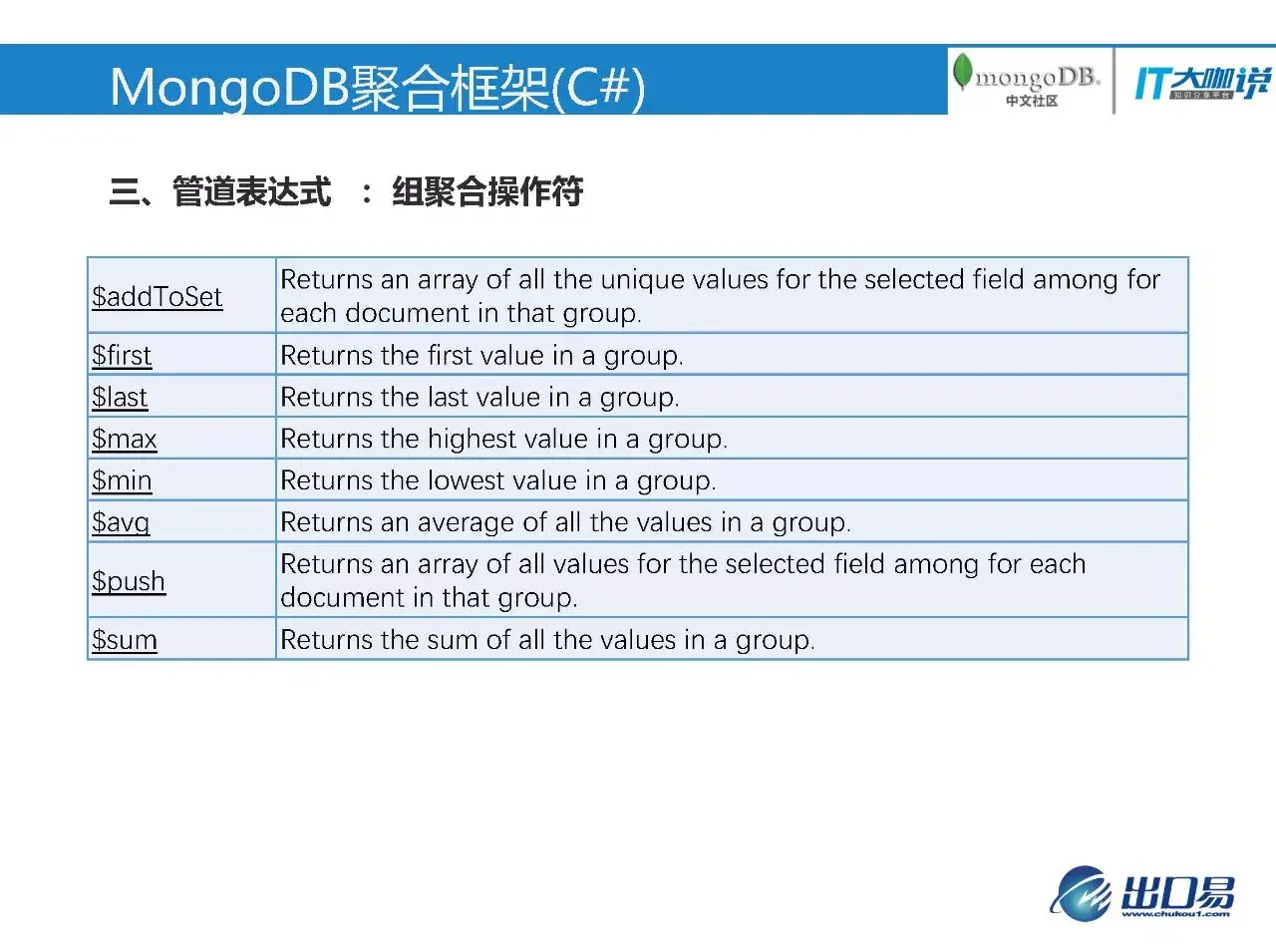 该框架使用声明性管道符号来支持类似SQL 中的Group by 操作的功能。不需要自己编写自定义的JavaScript。