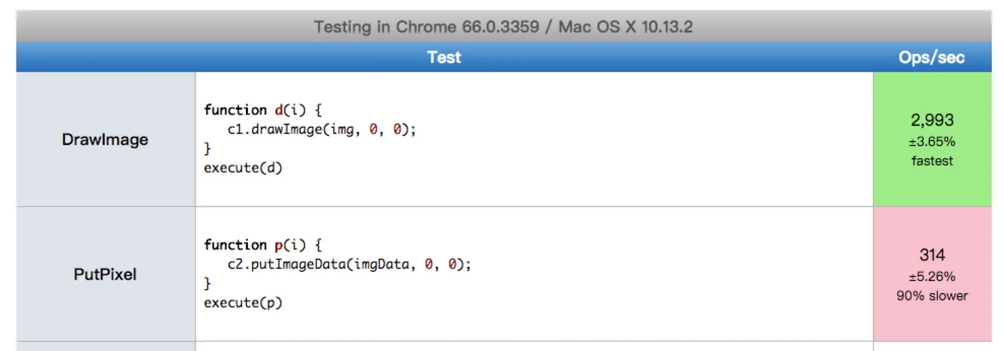 之前说过,我们通过对整个画布保存快照的方式来记录每个操作,换个角度思考,如果我们把每次绘制的动作保存到一个数组中,在每次执行撤销操作时,首先清空画布,然后重绘这个绘图动作数组,也可以实现撤销操作的功能。可行性方面,首先这样可以减少保存到内存的数据量,其次还避免了使用渲染开销较高的 putImageData。以 drawImage 为比较对象,看 jsperf 上这个测试用例,二者的性能存在数量级的差距。