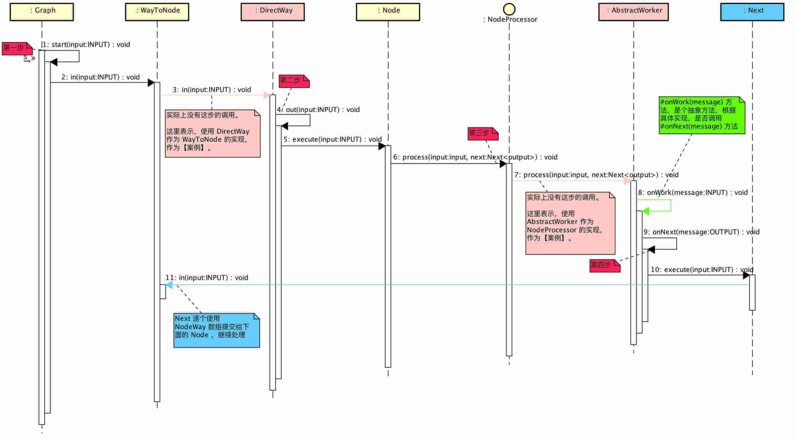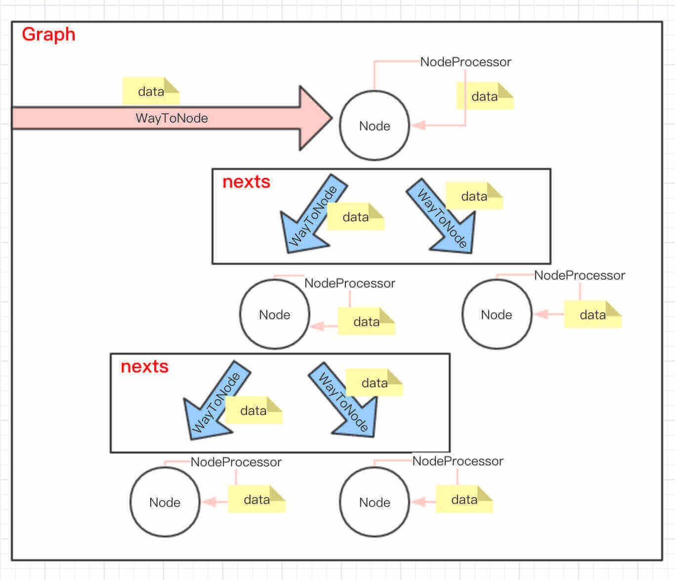 - 蓝色箭头:当 NodeProcessor 处理完成后,Next 逐个使用 NodeWay 数组提交给下面的 Node ,继续处理。