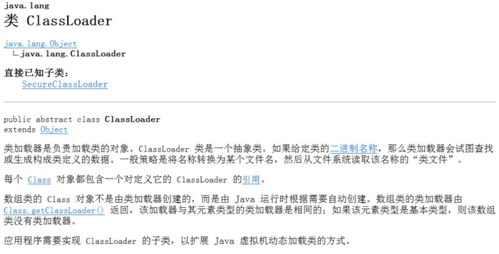 从文档中对ClassLoader类的介绍可以总结出这个类的作用就是根据一个指定的类的全限定名,找到对应的Class字节码文件,然后加载它转化成一个java.lang.Class类的一个实例.